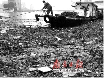 花花绿绿的胶袋、烧焦的鞋子和破轮胎、泛着油花的污水,还有远处漂来的浮萍……河水涨落之间,浸没于水中的污秽之物被裹挟在滔滔西江中,日夜不停地东流而去。每次看到这种情况,广州西江取水站的李工程师总是要让工人们马上进行快速打捞,以免影响周围水质。